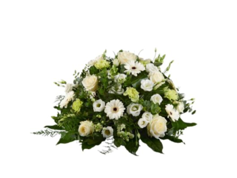 Dit ronde rouwstuk met witte gemengde bloemen zal zeer gewaardeerd worden.