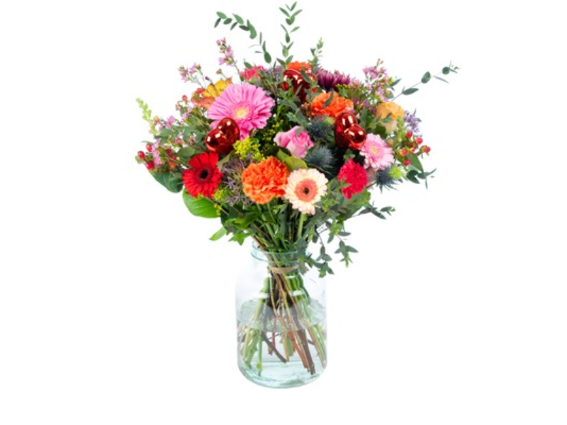 Een schitterend boeket in diverse kleuren, met ingestoken harten