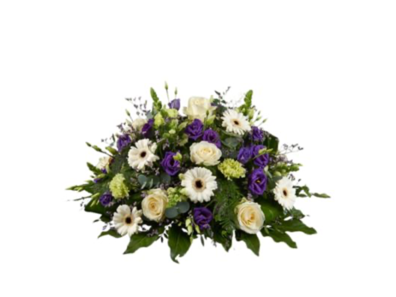 Dit ronde rouwstuk met paarse en witte bloemen straalt kracht en liefde uit.