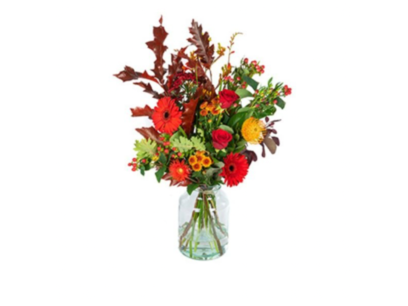 Laat je verrassen door de rijke kleuren van de herfst met dit warme boeket vol dieprode, oranje en gele tinten. Dit arrangement vangt de essentie van het seizoen met seizoensbloemen zoals gerbera’s, chrysanten en rozen. Perfect om je interieur te verwarmen of als een prachtig geschenk voor een herfs