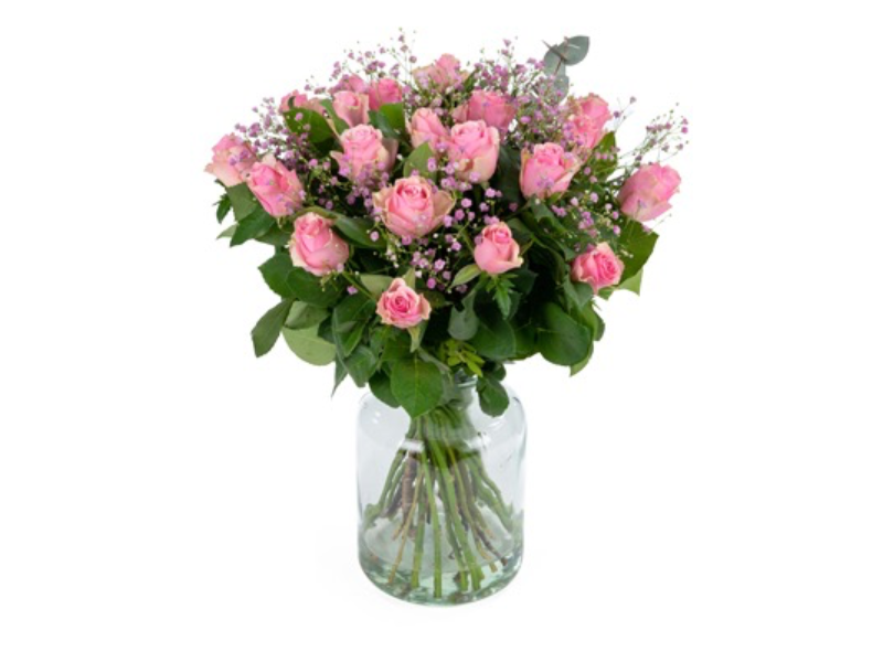 Liefdevol rozenboeket met zachte roze rozen van ongeveer 40cm aangevuld met roze gipskruid indien voorradig.