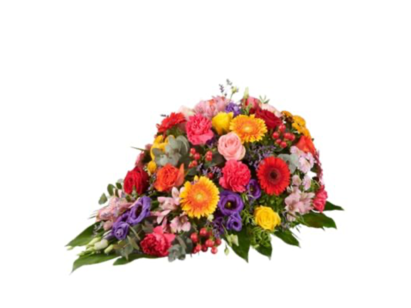 Een krachtig rouwstuk met bonte kleuren, waarmee je op een passende manier een laatste eer bewijst.